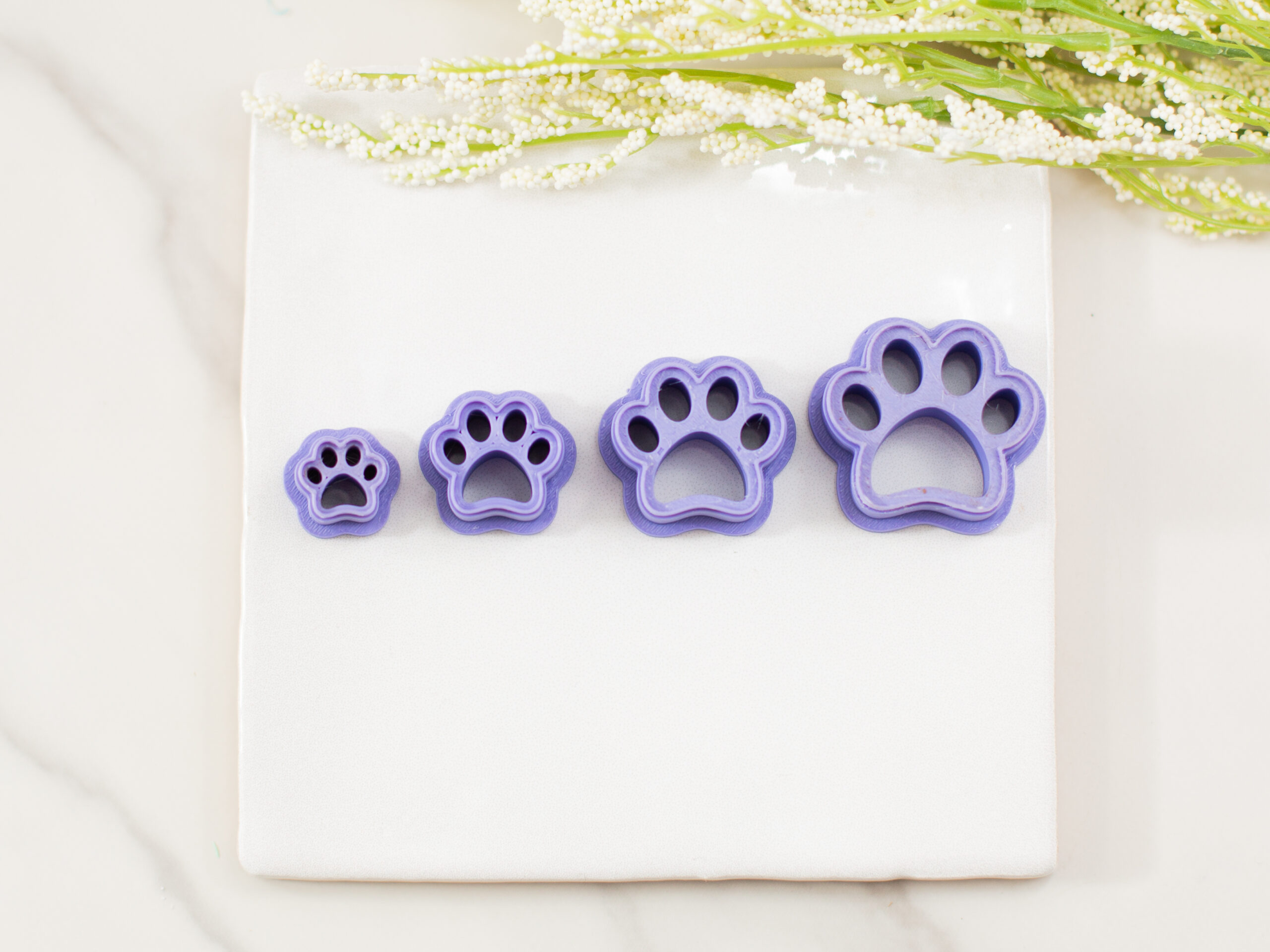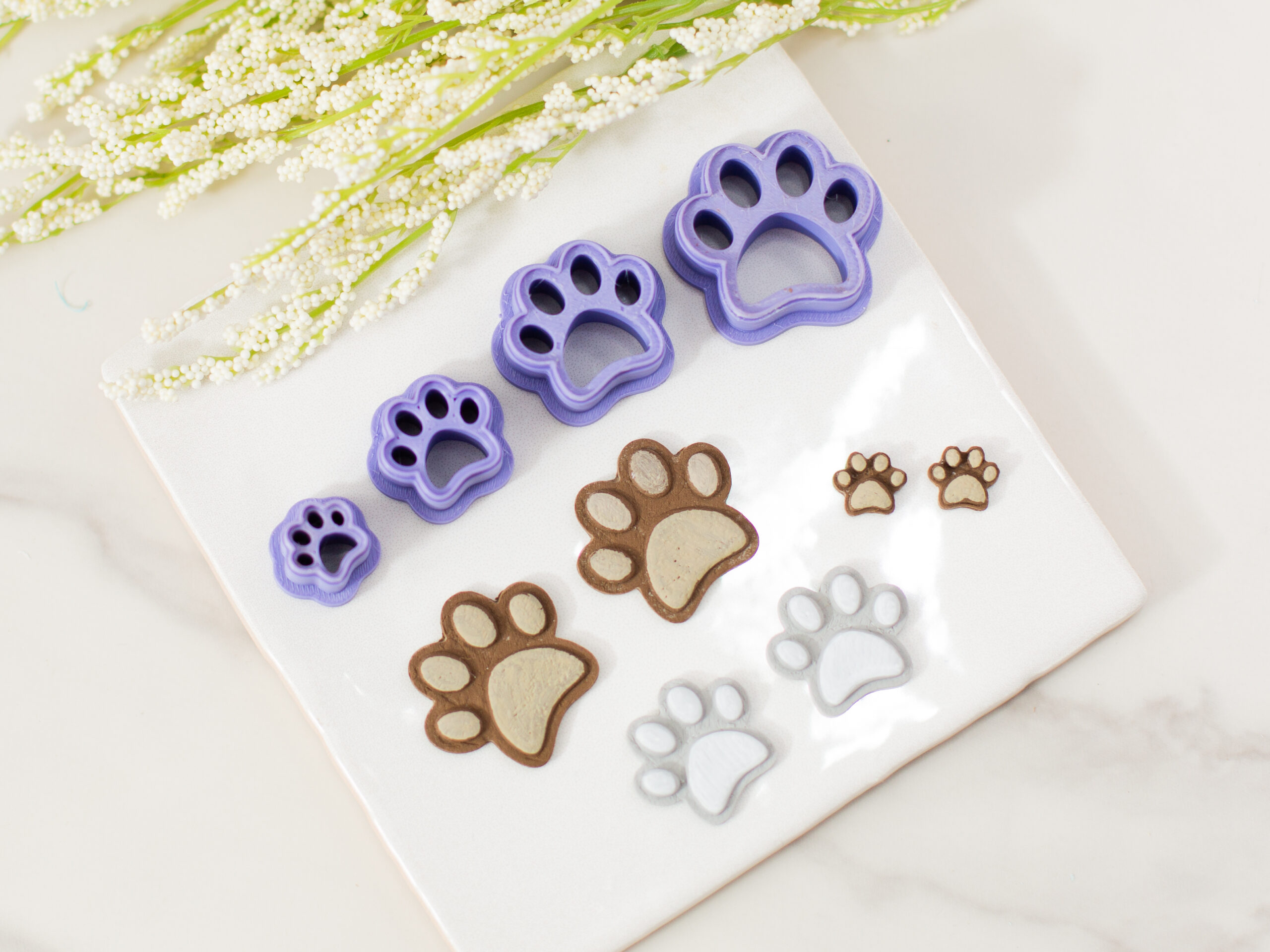 The simple yet recognizable paw shape makes it easy to pair with solid colors, textured clay, name cutouts, or number designs for custom pieces.